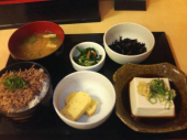 朝:ごはん、はまぐりのおすまし、たけのこ&わかめ、漬け物、じゃこ、チーズ、ヤクルト