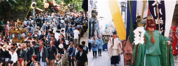 氷川神社では、明治末期から大正初期には山車の祭が盛んで、13台の山車が例大祭の際に氏子区域を巡行していました。現在では各町会の氏子崇敬者が熱心なご協力のもと、賑々しく神輿連合渡御が行われます。神様と人の結びつきを強くし、地域の活性化に果たす役割は、今も変わらず受け継がれております。
