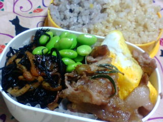 昨日1.8合玄米を炊いたのに、いつもの四等分(他三つを冷凍する)にならずに、家の雑穀米も詰めてきました。ひじきは焦がすし、お肉は適当だし、玉子には味付けなしだし、電車に間に合ったのが不思議なくらい。…てか、この程度の内容なのに電車にも間に合わなかったら最悪だよなー(笑)