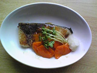 ①ブリは片栗粉をまぶし人参はいちょう切り、にんにくは薄切りにします ②フライパンにサラダ油とにんにくを入れて熱し、香りが出たら取りだします。そこにブリを入れ中火でこんがり焼きます ③ブリを取り出しA(だし汁75mlみりん大さじ1薄口しょうゆ大さじ1)と人参を入れて煮立て、次にB(酒大さじ1/2酢小さじ1)を加え少し煮詰めます ④同量の水で溶いた練りわさび小さじ1を入れ、水溶き片栗粉でとろみをつけます ⑤お皿にブリを置きソースをかけ軽く絞った大根おろしと貝割れを飾ります