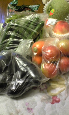 果物..............1050yen トマト5個.......300yen きゅうり5本....100yen 茄子6本........200yen 枝豆..............200×2yen 人参..............138yen いんげん......250yen