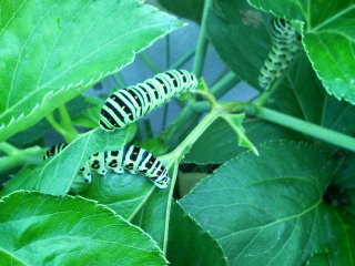 「はらぺこあおむし」 より・・ 【日曜日の朝にたまごからかえったあおむしはおなかがぺこぺこ。 食べるものを探し始めます。 月曜日にはりんごをひとつ、火曜日には梨をふたつ... 食べても食べてもはらぺこのあおむしは土曜日には食べ過ぎておなかを壊してしまいます。 あおむしはすっかりふとっちょになり、さなぎへと変化します。 そしてとうとう、きれいなちょうちょに変身したのでした。 】 会社の前にあるなんだかわからない葉っぱに 「はらぺこあおむし」がびっちりんこ@@; (苦手な方・・ごめんなさい^^;得意?な方はじっくりどうぞ♪)