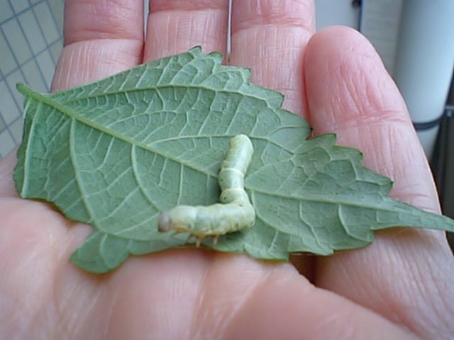【今日の感想】 また、ウチの大事な菜園で喰いまくっているヤツがいるなぁ…と、 今週になって気になっていたのだが、今日ようやく見つけることができた。 何の幼虫だろうか。 どうぞ、お元気で。 ヨソで大っきくなってくれたまへ。 ベランダから前の茂みに、ココロを込めてぶん投げた。