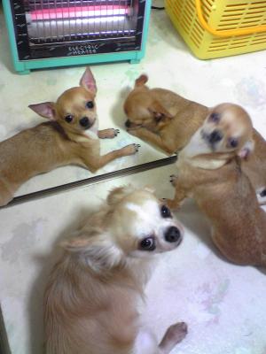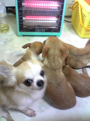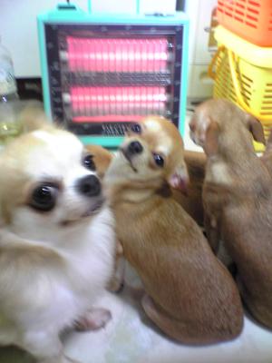 ちょび助の家には、8頭のチワワがいるんです。 この写真は、ロングがこの3頭の子犬達のパパで、みんなで、ストーブ前に集合です♪。 昼間は、イタズラばかりしています。 でも、ワンコって、可愛いですよね~~~♪。