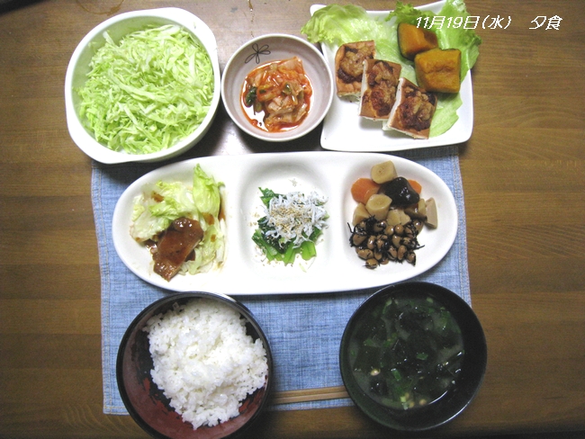 【間食】 ザバスアクア14g 【晩ごはん】 ご飯・納豆の味噌汁・キムチ・筑前煮・ひじき豆・カボチャの煮物・鶏の照り焼き・明太はんぺんピザ・サラダ・