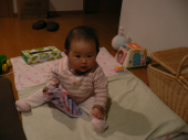 帰ってきて、まさくんはワクワクと箱を開けて、おもちゃをぴよにあげたのに、ぴよは包装されてた ビニールにしか興味しめさず・・・。しばらくおもちゃではなくビニール袋で遊んでた。 なんかまたまたかわいそうな光景を見てしまった・・・。 頭使うおもちゃはまだ早かったよねー。 赤ちゃん新聞はとってもお気に入りで放さない。わしゃわしゃわしゃわしゃ。
