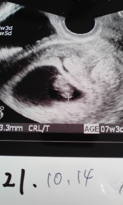 おっ! 早くも超音波の写真アップだぁ~♪ 自分のお腹のなかで生きてるってのを本当に目で見て確認すると、なんともいえない感激があるよねー☆ とくに妊娠初期はお腹が大きくないから本当にいるのかどうかよくわかんないだけに。 体も顔もまだ出来ていないけれど、かわいくて仕方ないでしょ?^^