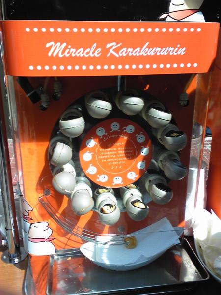 自動たこ焼き機、おもしろ〜い! 機械に描いてあるイラストがかわいいねー。 おじさんが焼いたののほうが美味しいんだろうけど・・・。