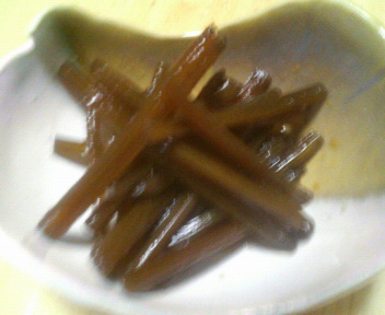 ………・・・・・・・・✁・・・・・ 出来上がりました。甘じょっぱくて、ご飯がすすむくんです。 夕方叔母を連れ買い物に行ったのだけど、夕方は買い物するもんじゃないなぁ~とつくづく<m(__)m> お腹が空いてる時間なせいか、見るもの見るもの美味しそう~ ちょっと買うはずだった買い物がみるみる山積みに~お金も出る出る~ しかも、スーパーのはしご・・・ 冷蔵庫の中が、中が、今宵は食べますぞ~