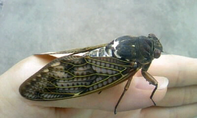 セミって、こんなにおとなしく手に乗っかっていられるものなのか?? きのっちゃんの手から、樹液が出てたとか・・・