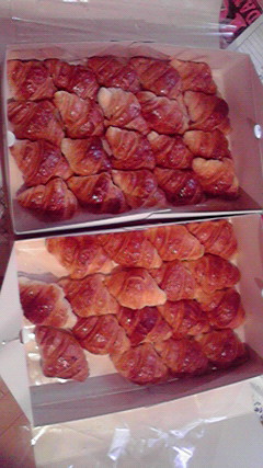こんばんわ。 やっぱり、出かけてたんだー。 ほんと半端ないお料理の量。すごい。 クロワッサンすごいね100個・・・そーそー、デニッシュ系と同じくクロワッサンはすごいバターの量使うから カロリー高い。 でも、美味しいよねー