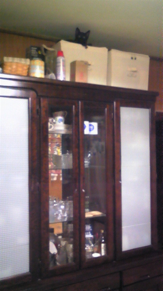 最近はこうして食器棚の上にのぼるように・・・ そこ、埃だらけなんだけど^^;