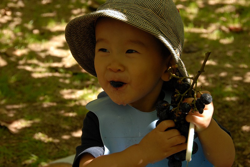 ぶどうは袋をかぶってるから、リュウにはあまりわからないんだけど、 袋を取って、ぶらさがってる大きなぶどうを見せると大興奮! 「ぶどう、ぶどう!」と大喜びでもぎ取って、食べること、食べること。 ベリーAという品種の巨峰みたいなぶどうだったんだけど、 むいてあげようとするのも嫌がって、皮ごと食べる食べる。 種も食べる。 もういいやと思って、好きなように、好きなだけ食べさせた。 1人で1房半くらいは食べたかなー。 大満足でした。