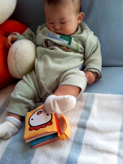 触るとガシャガシャ音が鳴る絵本を、足でもてあそんでるところ。 このシト、手より足の発達のほうが早いみたいで、よくわだすの皮膚を足の指でギュ~~ッとつねってきたりする。。。--; 巨大ミッフィーとあまり大きさが変わらなくなってきたなぁー。