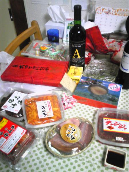 ぼわおーッ! kowkaちゃん、早っ! 昨日の旦那のミステリーツアーのお土産。どうやら山梨方面に行ってきたらしい。 うん、なんだかやたらキムチが多かった・・・。他にはワイン2本に、あわびの煮つけに、馬のタンに、唐辛子おかきに、、、、、、、、ツマミばっかりいろいろ。酒がやめられない。。。。。( T~T)