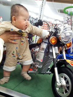 こうやって、三輪車から始まって、次はミニバイク、、、、最終的には大型免許とってハーレーに乗らせる。 ある意味、英才教育なのだ!(?)