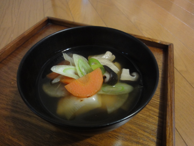 【写真2】 うちのお雑煮は、醤油ベースのおすましタイプ。 今年は大根、にんじん、しいたけ、ごぼう、鶏肉、長ねぎを入れました。