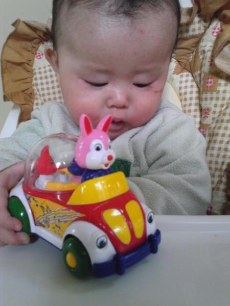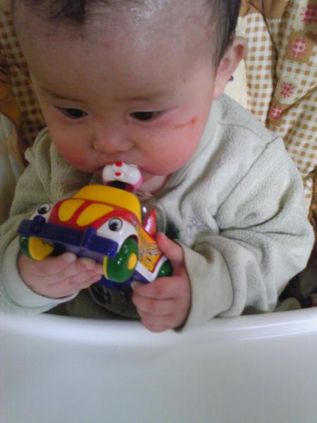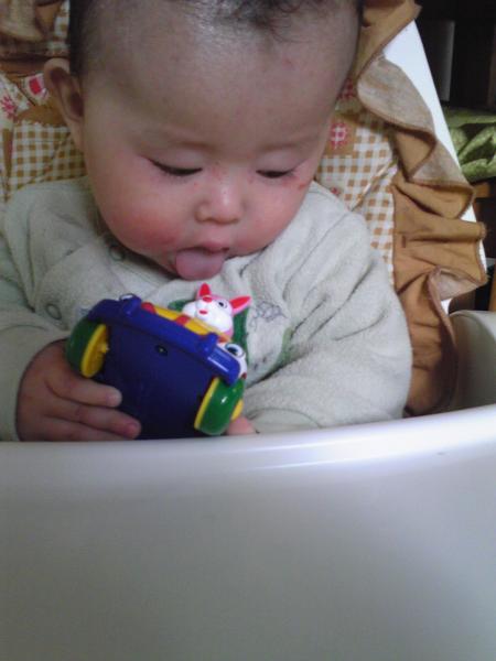 このおもちゃ、うちにもあった! とりあえず舐めてみる。赤ちゃんでは当然の行動ですね。