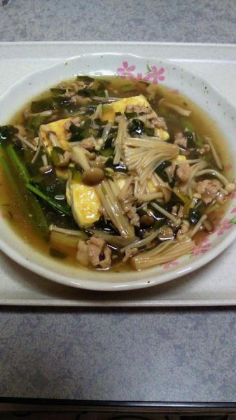 珍しく、ちゃんとしたお料理をしてみました。 お豆腐のステーキと菜ばなを一緒にして炒めて、 盛り付ける時に菜ばなを豆腐の下にして、 きのこのあん(小松菜を細かく刻んでいれてあります)を 上にかけてみました。 かなり甘めの味に仕上がってます・・・けど、お砂糖は使ってないよ。 お砂糖嫌いだから、料理に甘みを加えたい時はみりんを使います。 ってことは、お酒とみりんを入れ過ぎたか??? でも、まずまずの味なので、良しとしましょう(*^_^*)