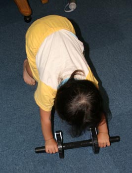 写真1は早速使っているどりり...ではなくて興味津々でコロコロしている次女です(^^; 写真2は今回購入した腹筋ローラー。どりり愛用のトレーニンググッズの仲間入りです。 ストッパーが見えにくいですが、きちんとつけています。