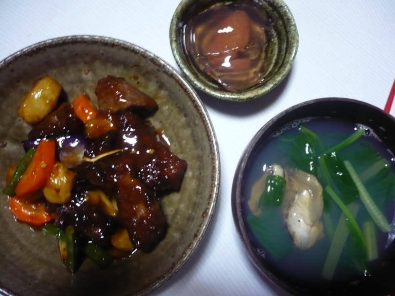 朝は野菜たっぷりカレー。 お昼は激辛つけ麺のお店で外食。 お昼は酢豚。 それと冷凍してあった牡蠣を入れたスープ。