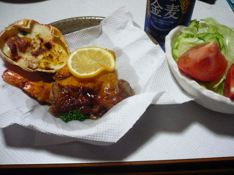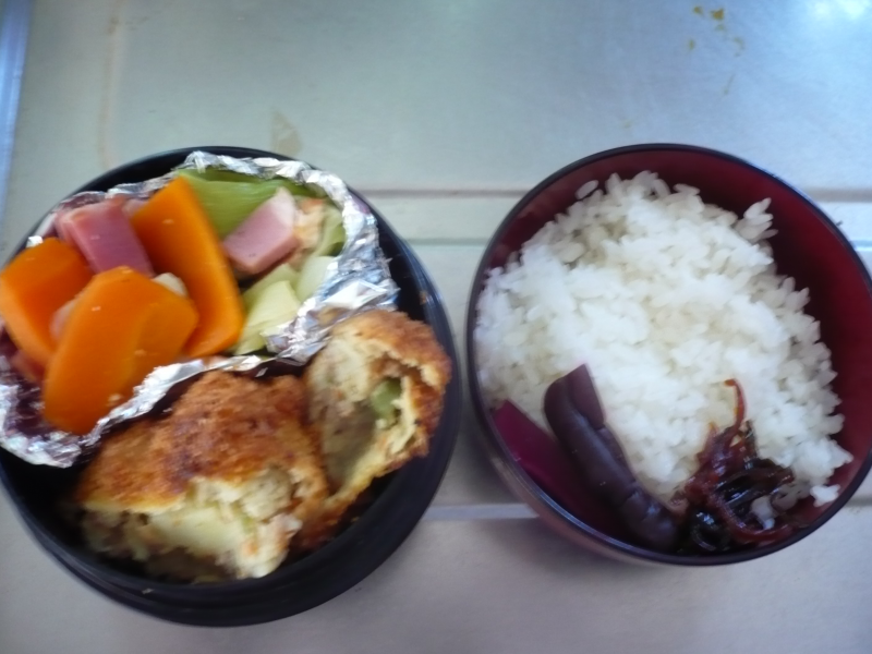 お昼は手作りコロッケと朝のそばの具にベーコンを足して野菜炒めに。