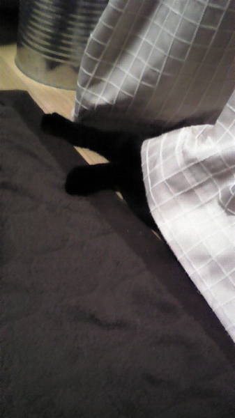 しかも私と一緒にじゃじゃも起きて来て 寝ようよ?寝ないの?と心配そうにニャーニャー鳴く(可愛い♪) 大丈夫だよ、寝てもいいよ~って言ったら 結局、PCの近くのカーテンの陰で寝ちゃいました☆ 写真は手だけカーテンから出てるぅ~♪(萌♪)