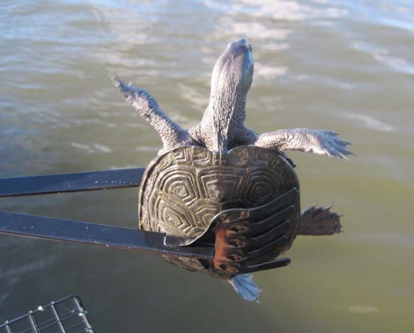 トングに挟まれたカメの手足の方向が笑えるー!! 「あ~れ~」と叫んでいるよう。。。(* ̄m ̄) ププッ すっぽんと思い込むべし!!
