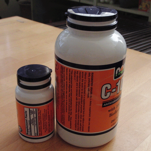 来年花粉4倍~、来年になったら考えればいい~なんていってましたが やはりちっと心配で買ってしまいました、 粘膜系を強くしようとビタミン剤を。 輸入販売でアメリカから買ったらビタミンCがびっくりする大きさ。 左がよくある通常サイズ、 さすがサプリ大国って感じっすよねー。 なにげに邪魔なんですけど~w。