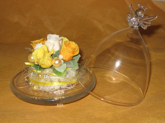 最終的には、次女が選んだプリザーブドフラワーのアレンジに決定(*^_^*) ガラスカバーのエンジェルが気に入ったらしい。 かわいいでしょ♪