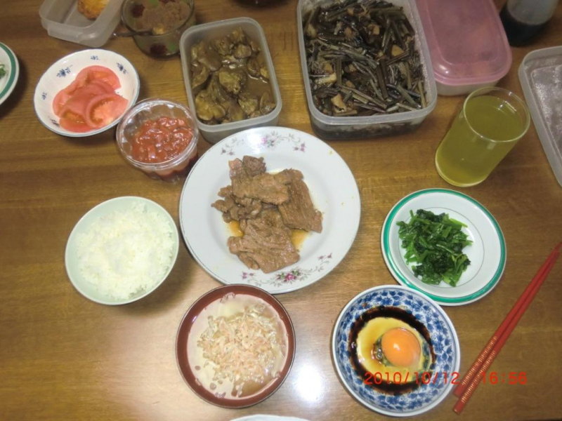 【今日の食事】 (1食目):納豆+ごはん (2食目):あるもので昼食。 (3食目):豚生姜焼き・・・。 3食しっかり・・・・こりゃ太るね~~┐('~`;)┌。