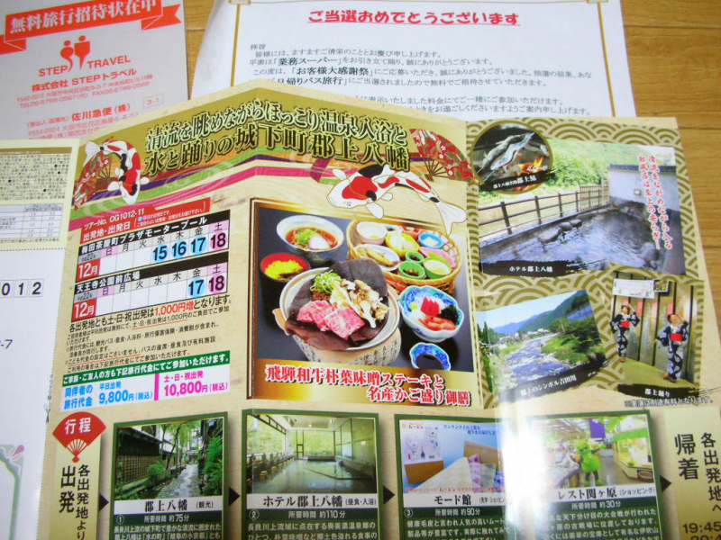 いつもいく業務用スーパーに@抽選で旅行があたる!@みたいな記入用紙と投入BOXがあったので 先日、必要事項を記入して入れといたら、なんなく当選したようで「無料特選日帰り旅行」のご招待状が届きました。 日帰り美濃路の旅・郡上八幡。岐阜県です。