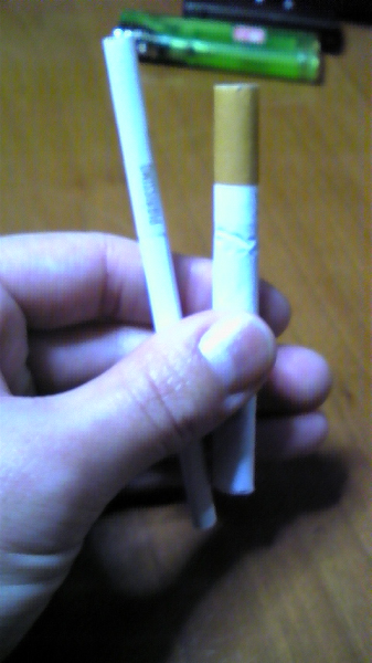 半分くらい?!ほそっ!! 今までの10本入りのケースで20本入ってるらしい。 値段は440円だか・・・^^; 旦那のタバコと比べても明らかに違う。 (そういえば旦那は結局禁煙できませんでした、本数はかなり減ったけど) 今のタバコはこんなのも出てるんだなぁ。 私が吸ってた頃(妊娠前)は250円とかだったっけ。