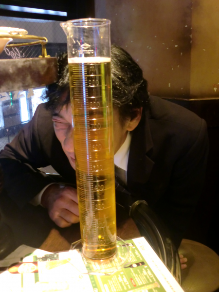 いいっすねえ。 いかがわしい仲間と飲み物。 ・・仲間はいかがわしくないっすね。^^;; 遊び心のあるお店は楽しいっすね。 試験管カクテルは見たことあるけど、シリンダビールはみたことないなあ。 でかい。@@
