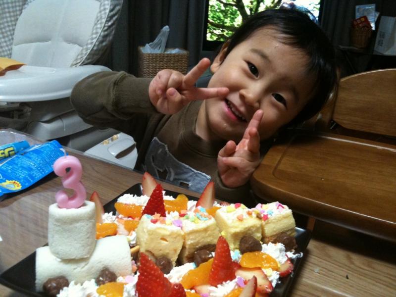 明日はリュウのお誕生日。 一日早いけど、日曜日だし、お祝いをすることに。 とはいえ、昨日からシュンが高熱を出していてグズグズで、 旦那は朝からサッカーへ。昼過ぎまで帰らない。 シュンは朝は熱が下がっていたものの、どんどん上がってきて泣きっぱなし…。 何とかリュウを昼ご飯食べさせてお昼寝させて、 2時前に帰ってきた旦那に留守番を頼んでケーキの材料を買いに走る。 とはいえ、今からケーキ焼いてられないので、ケーキ自体は買って来て、 周りのデコレーションだけ、手作り?することにした。 グズグズのシュンとハイテンションのリュウを横目にケーキ用意して、 ホントに慌ただしい中、ハッピーバースデー☆ 汽車のケーキをリュウも喜んでくれて良かった! もっとちゃんとお祝いしてあげたかったけど…これが精一杯でした、ごめんね…。。