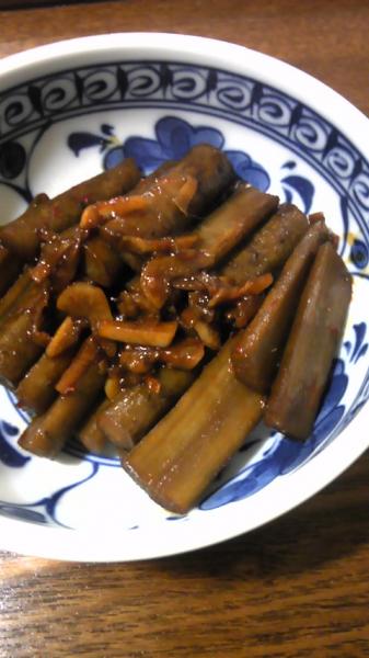 ついでに、これまた暮れに買ったゴボウを、韓国風の甘辛煮に。【写真2】 下茹でしたゴボウに、ショウガとニンニクを加えて、醤油・酒・はちみつ・豆板醤を煮からめました。 あ、コチュジャンじゃなくて豆板醤使ったから、中華風なのかな? いつものきんぴらに飽きたら、こういうのもいいかもね。