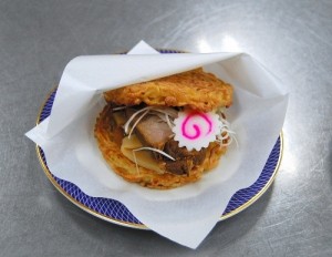 縮れめんを円盤状に焼き固め、パンズに見立て、