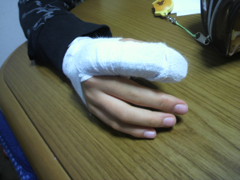 小5娘が右手人差し指を骨折した。全治2週間だそうだ。 人差し指にメタルプレートを副えて包帯で巻かれている。