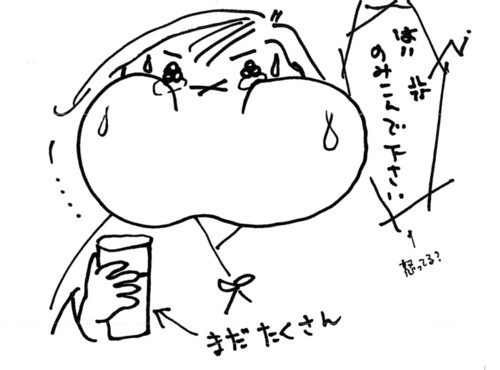 この絵、傑作(笑) そうそう、バリウム健診ってすごい体力と筋力が必要ですよね。 私だから、あんな過酷な動きができるけど(笑)体力・筋力のない 女性は、どうしているんでしょう? 検診台が斜め45度になってるのに(頭が下)、右回りに二周とか、 そのままキープとか、、、手を離したら落ちますがな、、、(汗) 胃の中にバリウム一杯でんがな、、、うっ、てなるよね、、、 ご苦労様でした。 結果は公表してください☆ 私も後ほど、、、