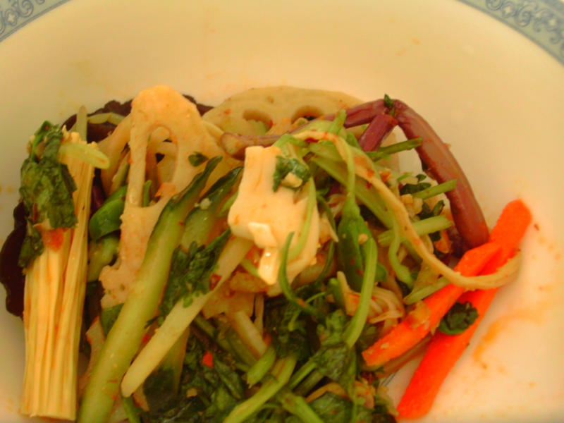 写真1の方は、ハマってしまっている和えもの。 サラダーバーの様にイロンナ野菜やもどした乾物があるところで、 好きなものを選んでボールに取り、お姉さんに渡すと、 魔法の粉?やら辣醤、大蒜、刻んだ漬物、香菜、キュウリ… などなどをイイ具合に混ぜて味付けしてくれる。 野菜も生野菜は少なくて、 茹でた野菜や山菜、湯葉、こんにゃくみたいな物体、キクラゲ、茎ワカメ、茹でピーナッツなどなど、 身体に美味しくって、わたしの好物が多い。 これが実に旨い。 こっちは惣菜なので、丼ぶり一杯で150円くらいと少し高めだが、 あまりの美味しさに、売り場に近づくとツイツイ…買ってしまう。 そして、腹いっぱい食べてしまう。 ああ、ヤバい。