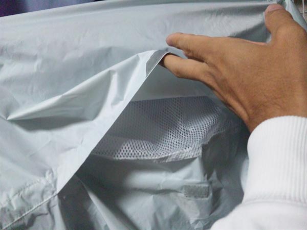 背中にメッシュがついてて、一応通気性があるらしい。 素材もなんとなくただのビニールとは違うような気もするようなしないような...。 ただ、家の中で着たらやっぱり暑かったです(^^;