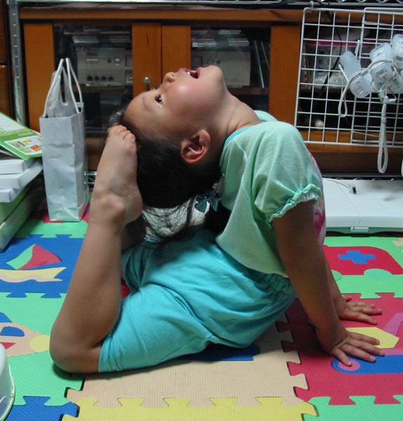 昨夜の次女です。 突然、目の前でこんなこと始めました。 新たなストレッチでしょうか?(^^; それにしても、スゲーーー! 写真の体勢のあと、足の裏が肩の上にのりました...。オソルベシ。 どりりも試してみましたが、足と頭はくっつきませんでした(^^;;; 長女も試してみたところ、かろうじて足と頭がくっつきました。 次女ほど余裕しゃくしゃくってわけじゃないけど、立派立派! この後、次女の奇妙なストレッチ(?)をいくつか見せてもらいましたが、 え?なんでそこがそう曲がるの?というような体勢もあり、オドロキ満載のショーでしたよ(^^;