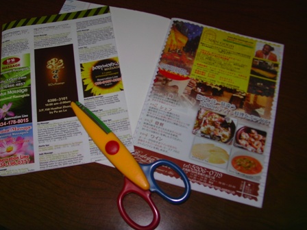 スクラップ・ブック作成。 情報紙から切り取った、飯屋、マッサー、医院、などなどの記事やら広告を貼っつけるだけだけどね。