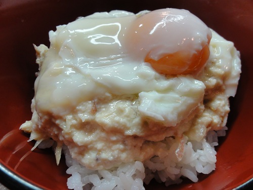 ネギ、ゴマ、細かく切った「いぶりがっこ」をぐちゃぐちゃにした豆腐とからませ、適量の醤油を入れ具を作る その具をご飯の上にのせ、最後に温泉卵をトッピングしたら完成。
