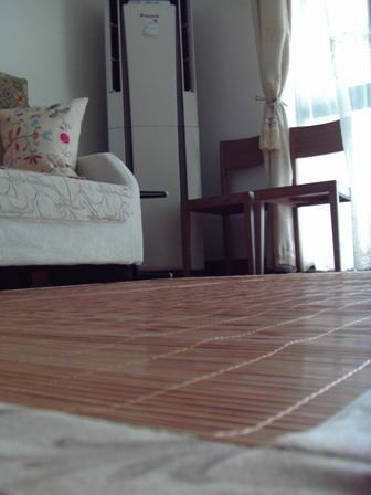 リビングの暑苦しい絨毯に竹シーツでカバー。 汗だくのままヘーキで布製ソファーに座る夫のコーナーも、 使わない足ふきマットや竹シーツでコーディネイト。 ここから出るなと云ったら、 コーナーを作ってもらって嬉しいやら切ないやら…だそうで。 それはわかったけど、出るな。 きっぱり、出るな!