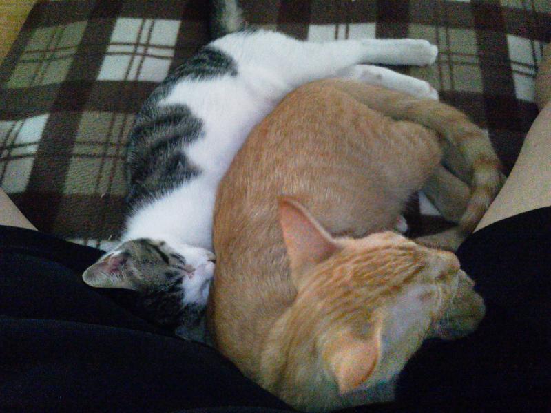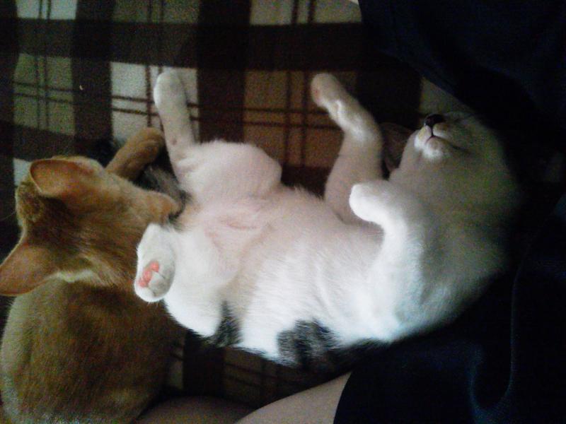 ところが最近あさりが自分からくっついて来るようになりました。 すると、えびは面白くないのかすぐにニャーニャー鳴いてあさりを押しのけます。 あさりをなでていると割り込んできます。(^^;; 2匹とも可愛いのになぁ。 猫もやきもち焼くんですね。