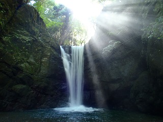 パンフレットをもらい、おばちゃんの説明どおりに駐車場の奥にある小道を歩きます。 光滝(こんたき)へは約6分。 時間は午前10時ごろですが、ちょうど滝の後ろの木々の間から射しこむ木漏れ日が滝から上がる飛沫を照らし、 御光が射しているように輝いていました。2日前にまとまった雨が降ったせいか、水量も多かったです。