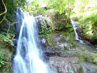 そこで帰るつもりでしたが、折角だからとその奥の夫婦滝へ行きました。 20分ぐらい歩くと2本の滝が見えました。落差は約5mのこじんまりとした滝でした。 今まで迫力のある滝を見てきたので、ちょっと拍子抜けしました。 歩くのが目的なら、このルートが楽しいかも知れません。