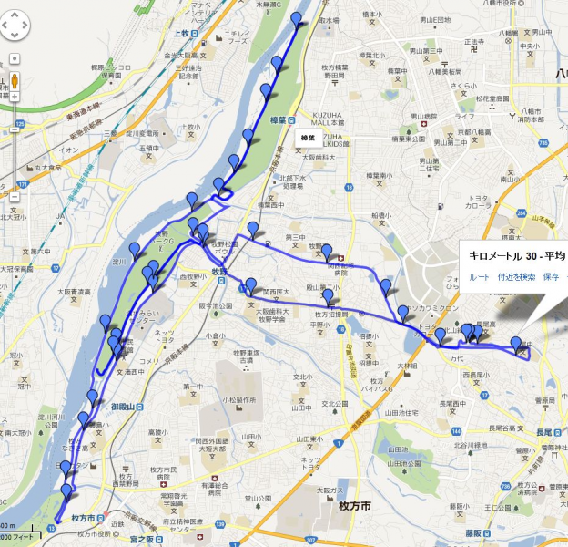 淀川までの道のりは、 普通の道なんで走り難いですが・・ 淀川に出ると・・・障害物や信号の無いフラットな道が延々と・・・続くので、 帰りの距離も計算しながら、 写真1のように迷走してました(苦笑)