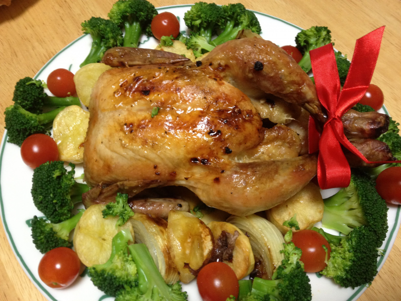 イブの夜は、鶏の丸焼きと、クリスマスケーキと一緒に更けていく…。 そして、明日の朝……更に体重が増えていることと思うな~。